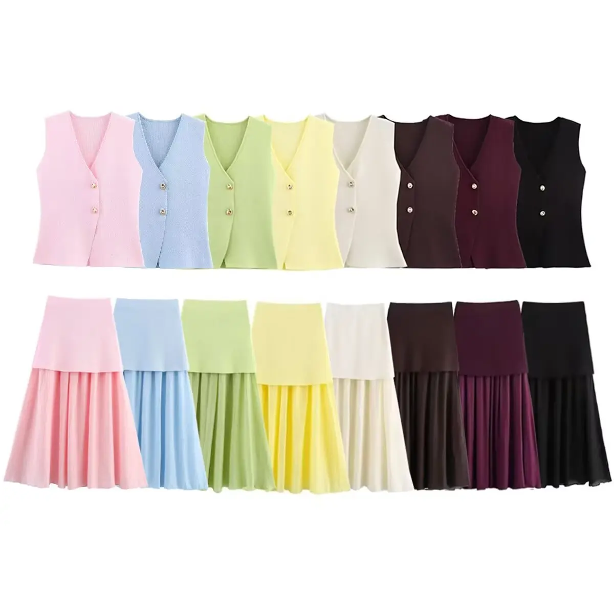 2025 Summer Button V-neck Vest Top Ankle-Length Skirt Lady Street Outfit 2 Pieces Women Knitted Sets Loose Skirt Set